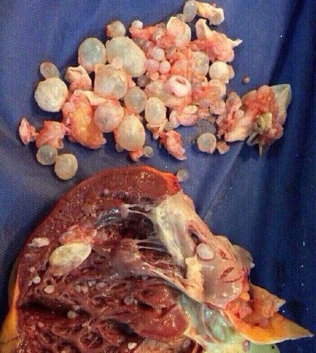 2. Macica zarażona kolonią pasożytów. Niestety usunięcie ich nie było już możliwe, ponieważ pasożyty i ich larwy całkowicie wypełniły macicę tej pacjentki i kilkukrotnie powiększyły jej rozmiar. Dlatego konieczne było jej usunięcie. Kobietę udało się uratować. Zatrucie organizmu było jednak tak dalece posunięte, że musiała poddać się specjalistycznemu leczeniu po usunięciu macicy i niestety zmarła 3 lata później.